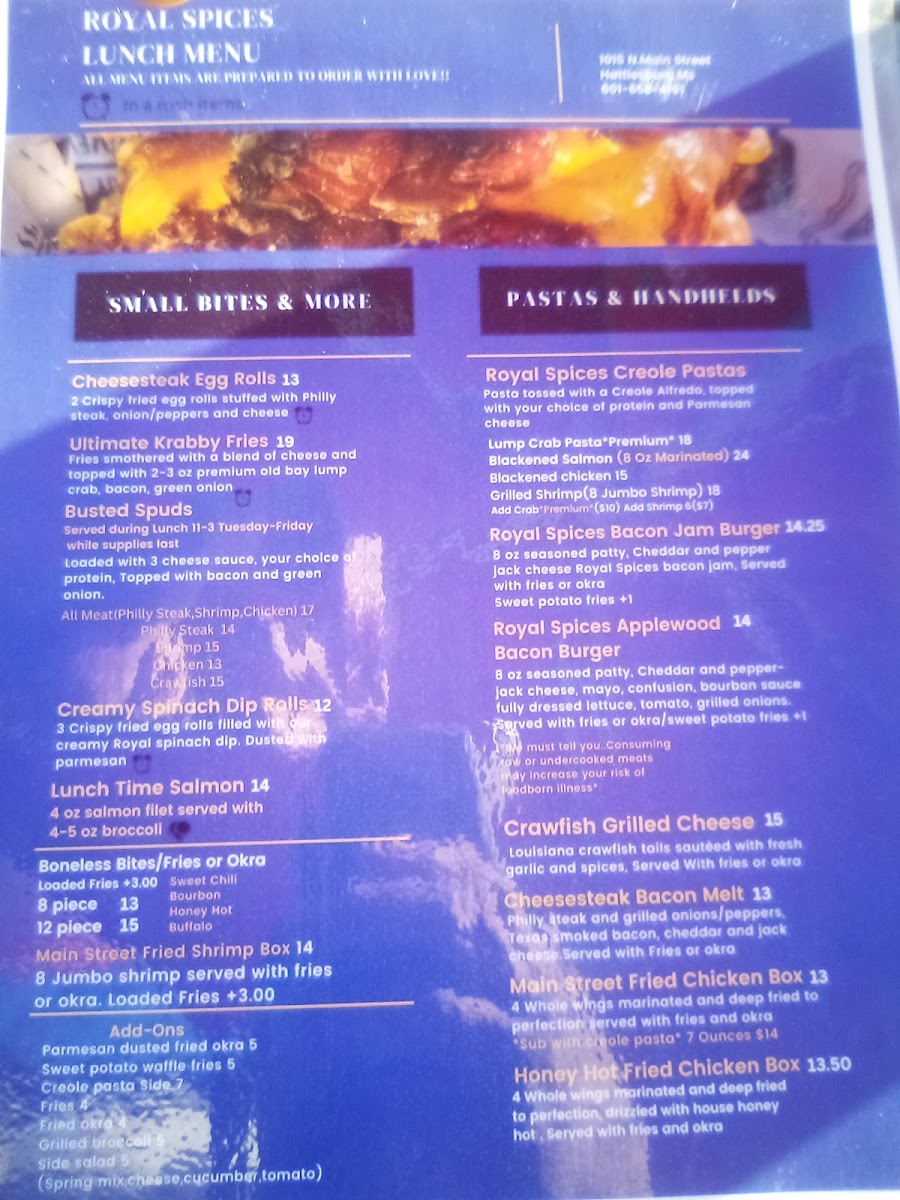 Introducing a culinary gem in Hattiesburg, Royal Spices offers a vibrant menu that reflects the rich flavors of Creole cuisine. Nestled at 1015 Main St, this eatery specializes in a diverse array of dishes that tantalize the palate and captivate the senses.